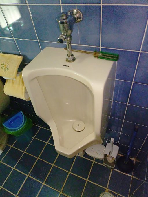 20年以上使用している小便器でフラッシュバルブの洗浄ボタンを押して流すと止まらないことがあり、便器との接続部から水漏れが発生して床が濡れてしまう状態でした。