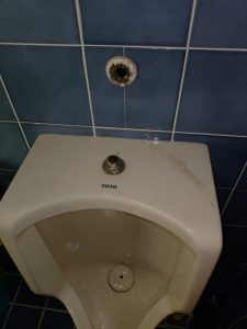 20年以上使用している小便器でフラッシュバルブの洗浄ボタンを押して流すと止まらないことがあり、便器との接続部から水漏れが発生して床が濡れてしまう状態でした。
