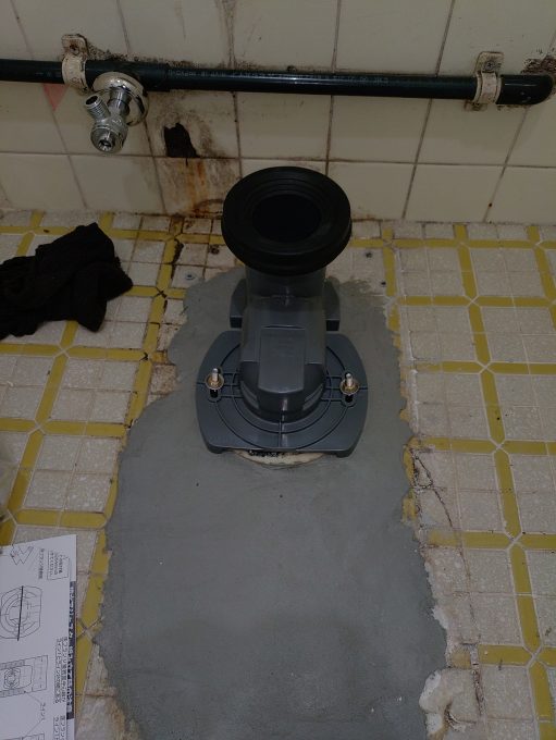 既存の便器を取り外すと、タイルがボロボロで剥がれており、速乾セメントで補修し新しいTOTOの便器とウォシュレットを取り付け、最後に排水管を高圧洗浄機で洗浄し作業終了しました。