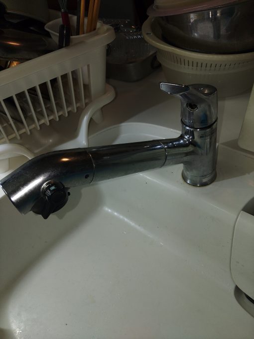 部品交換蛇口丸ごと交換提案し、丸ごと交換希望で浄水器無しのハンドシャワータイプTKS05305JAを選ばれたので、既存の台所蛇口を取り外し新しく選んで頂いた蛇口を取り付けました。
