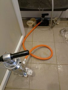次にトラップ内の排水口から排水管内に溜まっている汚れを、圧縮した空気を放つ専用ポンプで吹き飛ばします。