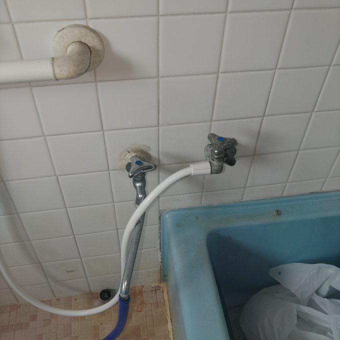 築50年蛇口使用30年の現場で横水栓がお湯水一台づつ設置されており、使いずらそうな状況でお湯側蛇口がハンドル硬直し回せませんでした。