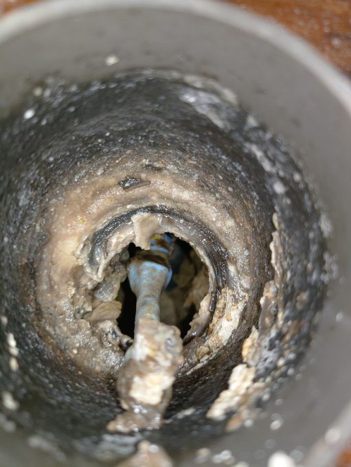 蛇腹ホースを取り外し中のスプーンやハンガーを取ります。排水管に落ちた歯ブラシも取り除きドレンクリーナーと薬品で排水管洗浄し作業終了致しました。