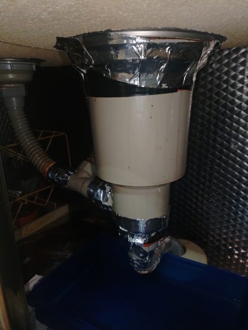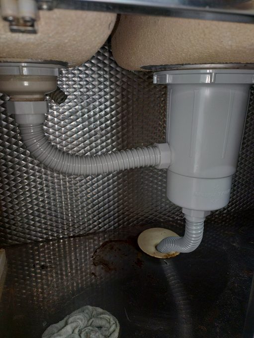 洗い物をするとシンク下の排水栓、排水ホースから水漏れしている状況でした。お客様自身で応急処置としてアルミテープを巻かれておりましたが水漏れ止まらずバケツにて対応していました。