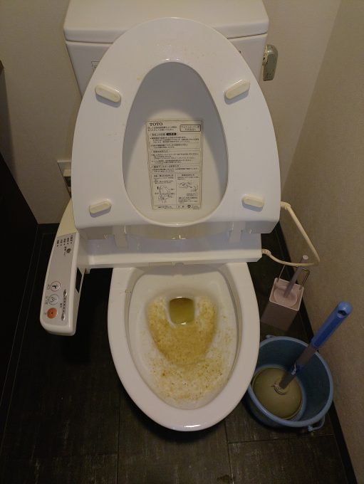 トイレを流すと便器内で溢れそうになり徐々に引いていく状況でした。お孫さんが誤ってパンツを流してしまい詰まったそうです。