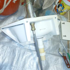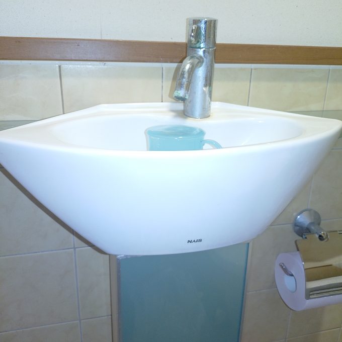 手洗い器ボウルを一度取り外さないと蛇口が脱着できないため、壊れないように注意しながらボウルを取り外して、新しい蛇口を取り付け水漏れを直すことができました。