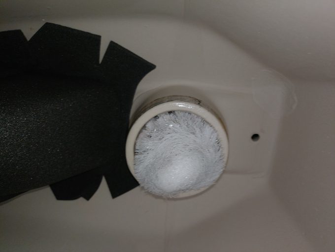 水を止め、タンクに貯まった水と便器に貯まった水を除去し、タンク、便器を取り外したところ、便器裏側排水出口のところにブラシ先端が引っかかっており除去。