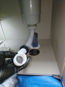 まずはシンクの排水栓(トラップ)接続部のピンホールをシリコンで埋めてパッキン交換して止水します。
