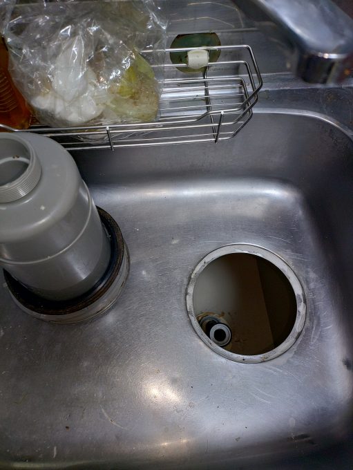 台所シンクの排水栓取付け部が錆びていてピンホール(小さい穴)から蛇口を使用するたびに水漏れする状態でした。