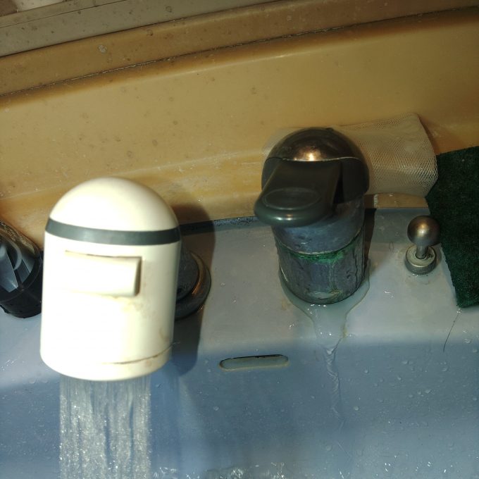 30年以上使用した洗面蛇口レバーから水漏れしていると伺い点検すると、レバーとシャワーホースからも水漏れしていました。