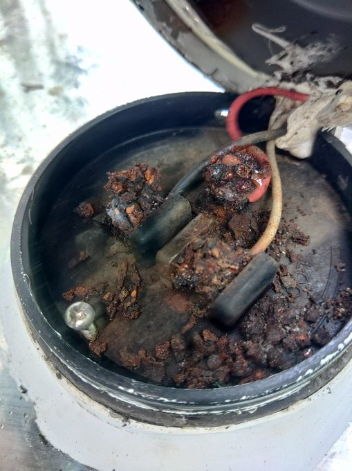錆び付いた保持機を交換対応しました。保持機はタンク内の水の溜まり具合でポンプが連動するための部品で、保持機の交換と電気屋さんの漏電修理で直りました。