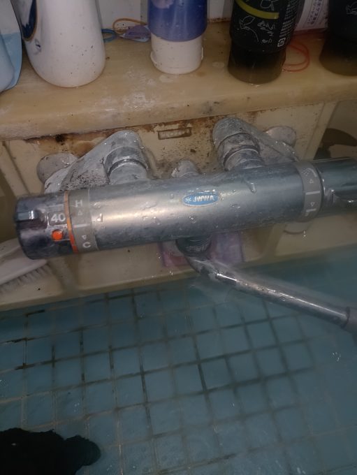 メーカーへ部品の品番等の確認も取りましたが、部品供給が終了しており残念ながら修理不可能な状態でしたので、TOTOのサーモスタット式の浴室蛇口へと交換させて頂きました。