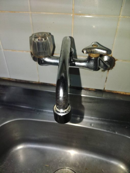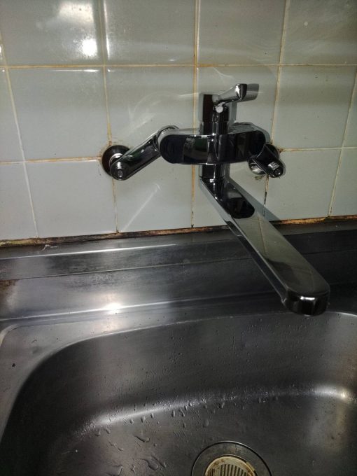 台所のツーハンドルタイプ蛇口でハンドルを回して閉めても、吐水口から水がポタポタ漏れている状況でした。