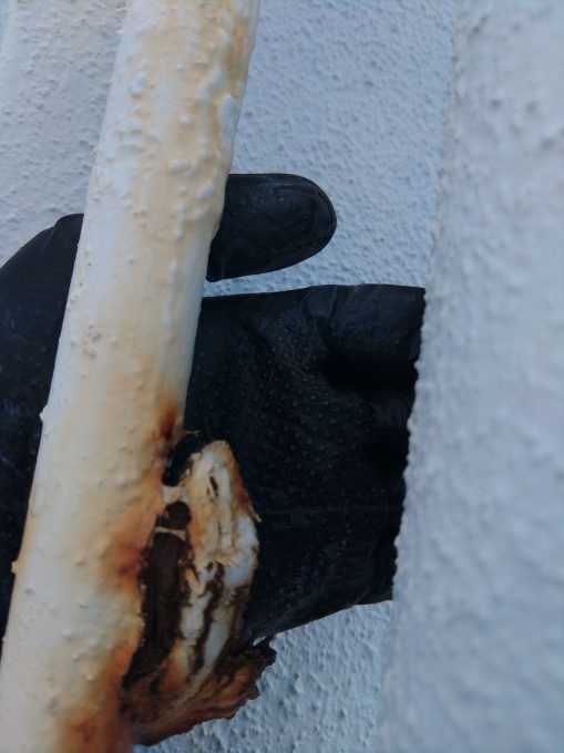 屋上に繋がってる水道管が錆で小さい穴が開いており、そこから水が細く吹き出していました。
