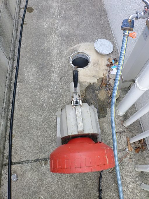 まずはドレンクリーナー(業務用ワイヤー)でしっかり詰まったところに穴を開け、次に高圧洗浄機を使い詰まりを完全除去。