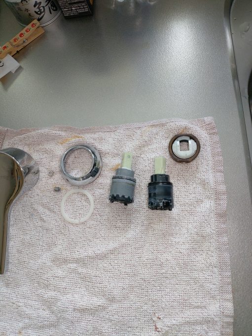 蛇口本体を分解し、カートリッジ(シングルバルブ部)を取り出します、石灰が強くその影響でカートリッジが劣化し水漏れが起きたようでした。
