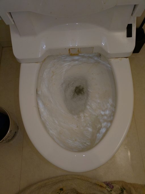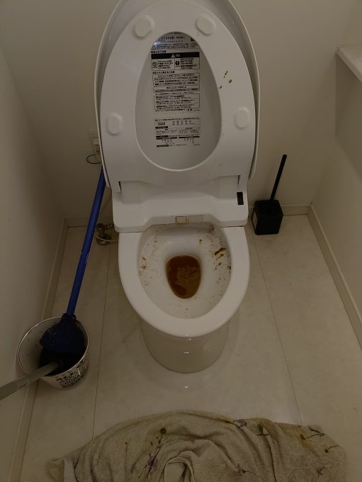 特に異物混入の恐れはないとの事でしたので、業務用のローポンプを使用し便器内に詰まってしまった汚物やトイレットペーパーを揺すりながらタイミングを見て除去していきます。