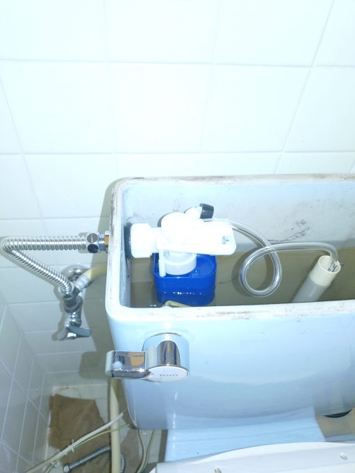 途中、貯水槽を確認すると水道管直結になっておりますので、水圧が大変強いと思われました。実際トイレのタンクを確認すると何十年も前の廃盤モデルでありました。