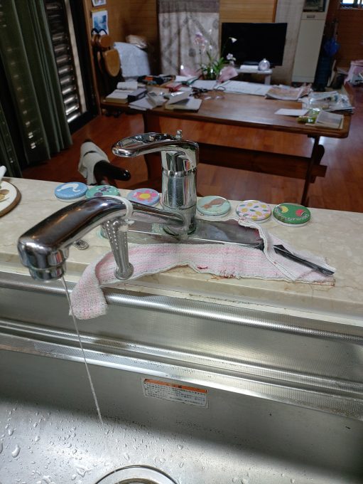SANEI製の台所蛇口本体からじわじわと水が漏れており、お客様に状況説明の上本体内部のカートリッジ交換となりました。