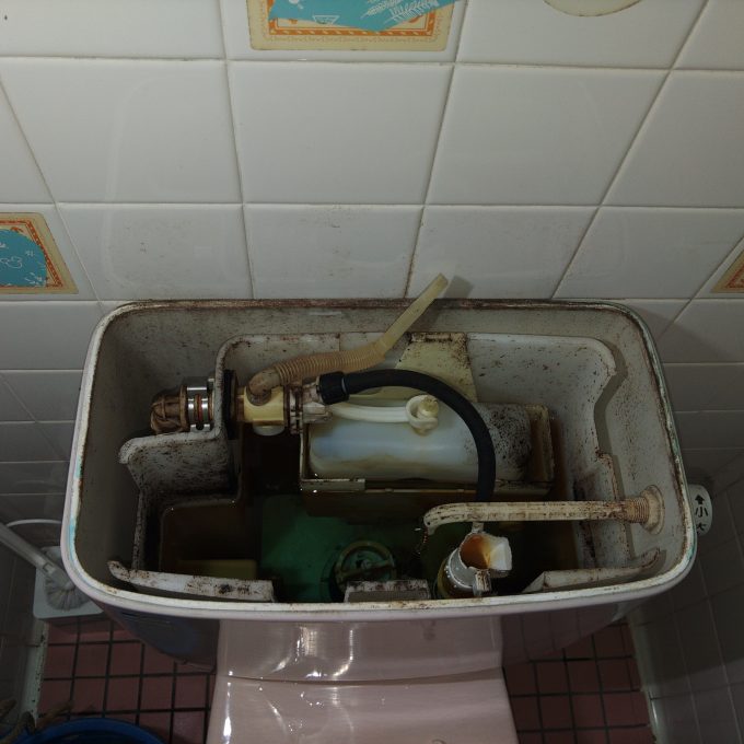 築50年の現場でトイレのフロートバルブチェーンが切れて流せなくなり、フロートバルブのゴムが劣化し水漏れもしており、ボールタップの劣化している状況でした。