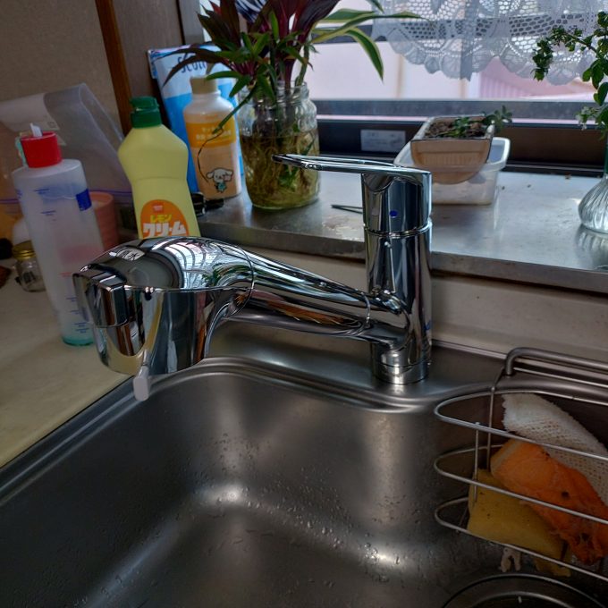 シンクの下にもぐり込み古い蛇口を取り外し、シャワーホース、浄水付きの台所蛇口を取り付け、水漏れ、動作確認をして、お客様に使用方法、注意点を説明し作業終了となりました。